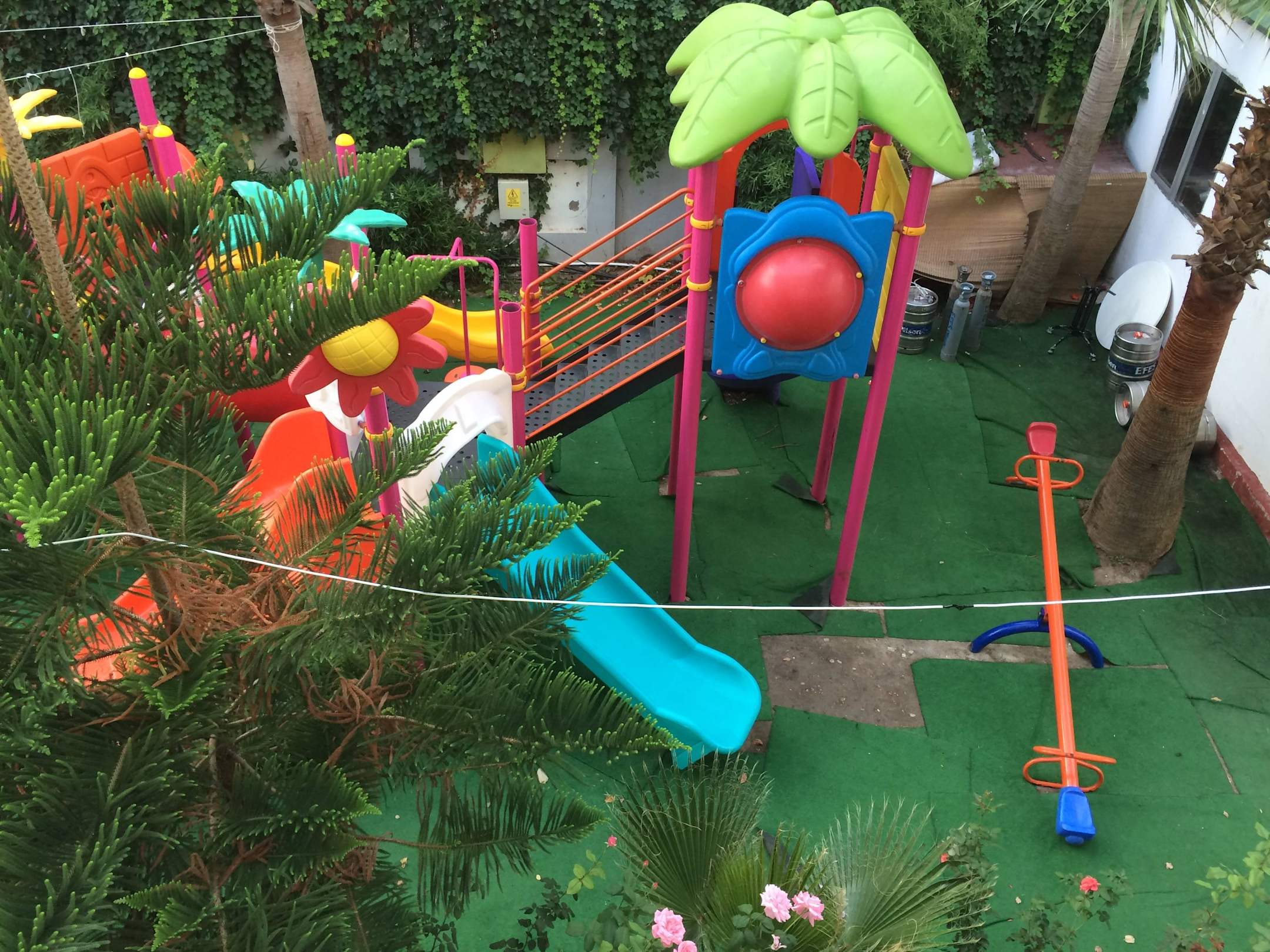 "Spielplatz" - rechts Gasflaschen und Bierfässer