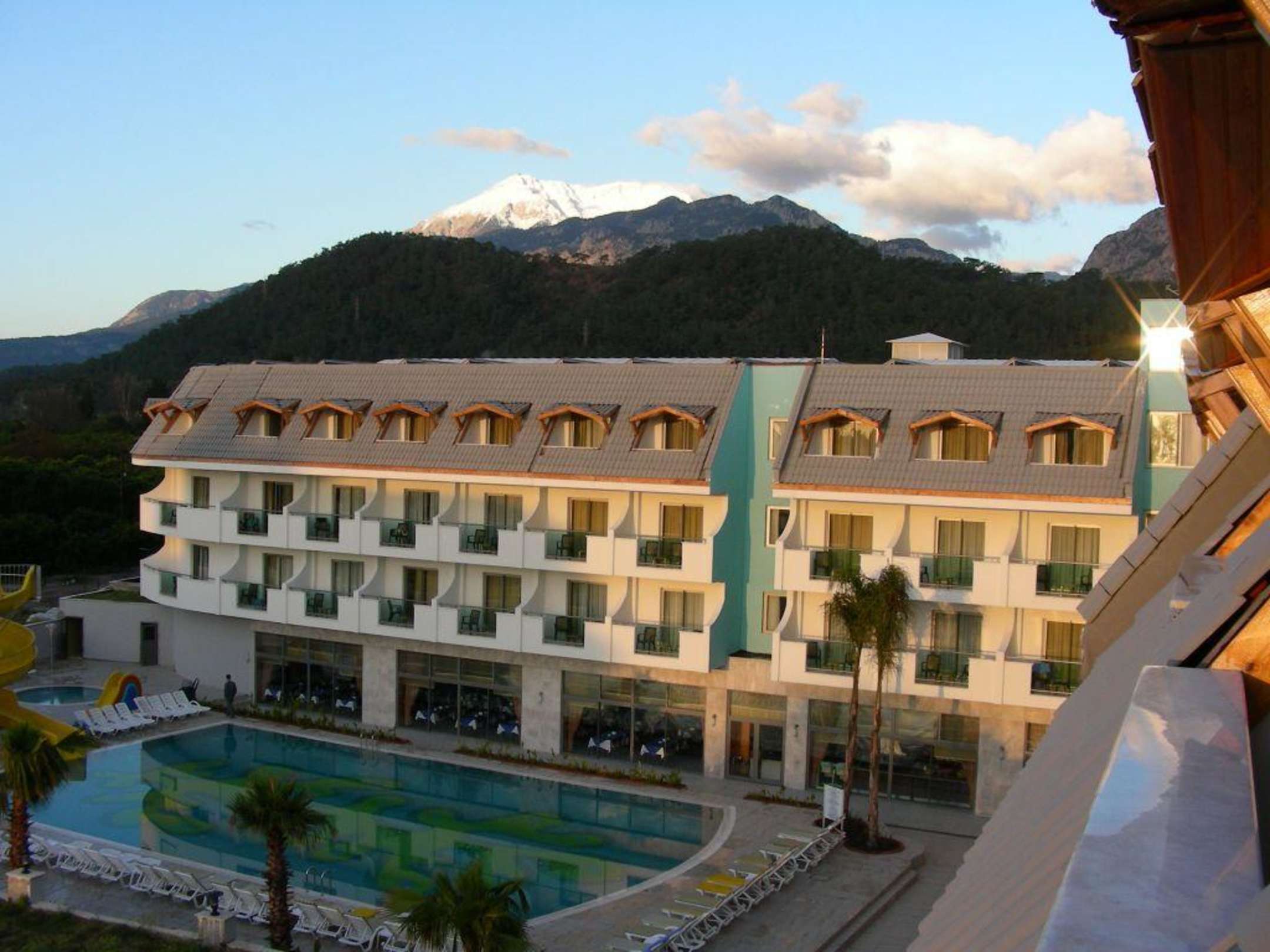 Aussicht vom Hotelzimmererste Morgensonne auf einem Hoteltrakt, im Hintergrund der Tahtale-Berg (Olymp der Antike)