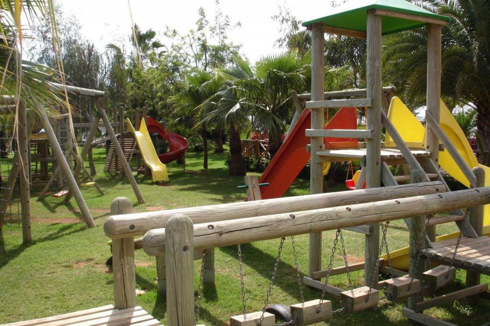 Ausblick auf den Hoteleignen Kinderspielplatz im Garten. Nähe zum Pool und direkt neben einer Bar, so daß man beim Cafetrinken den Kindern beim spielen zuschauen kann.