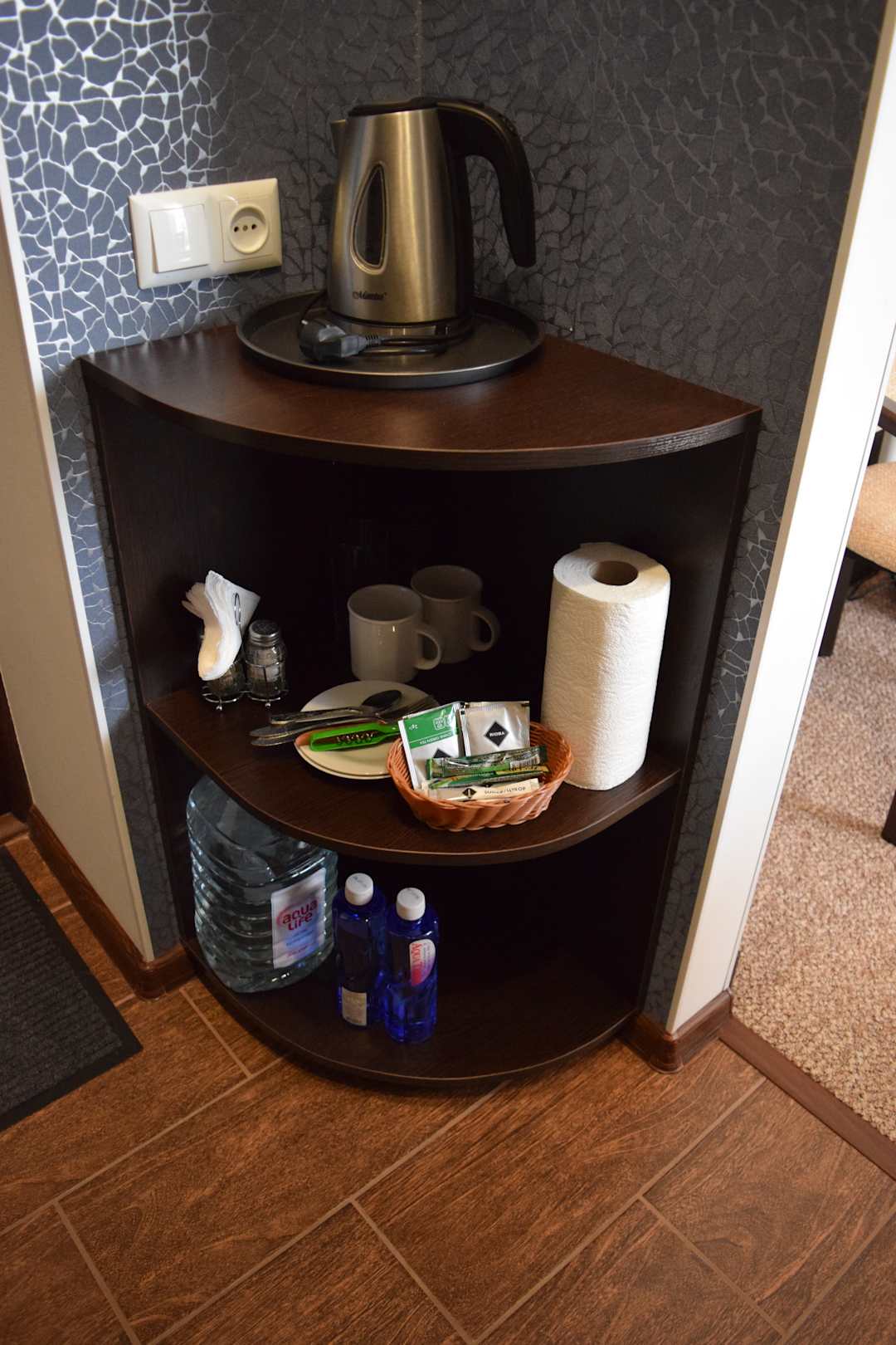 Im Zimmer: Wasserkocher, Wasser, Gratis-Tee/Kaffee