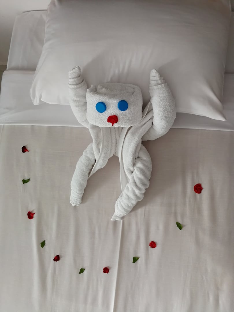 liebevoll gemachtes Bett mit Figur