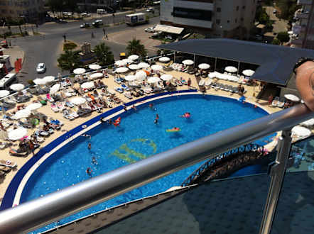 Aussicht auf den Poolbereich aus der 1. Etage