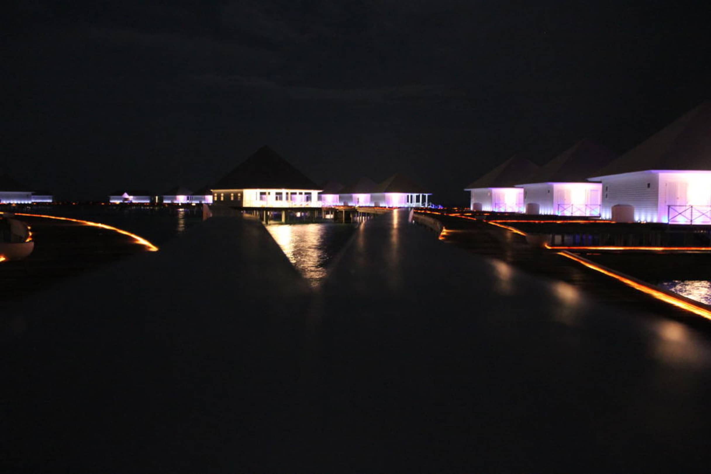 Der nächtliche Steg zu den Wasservillen