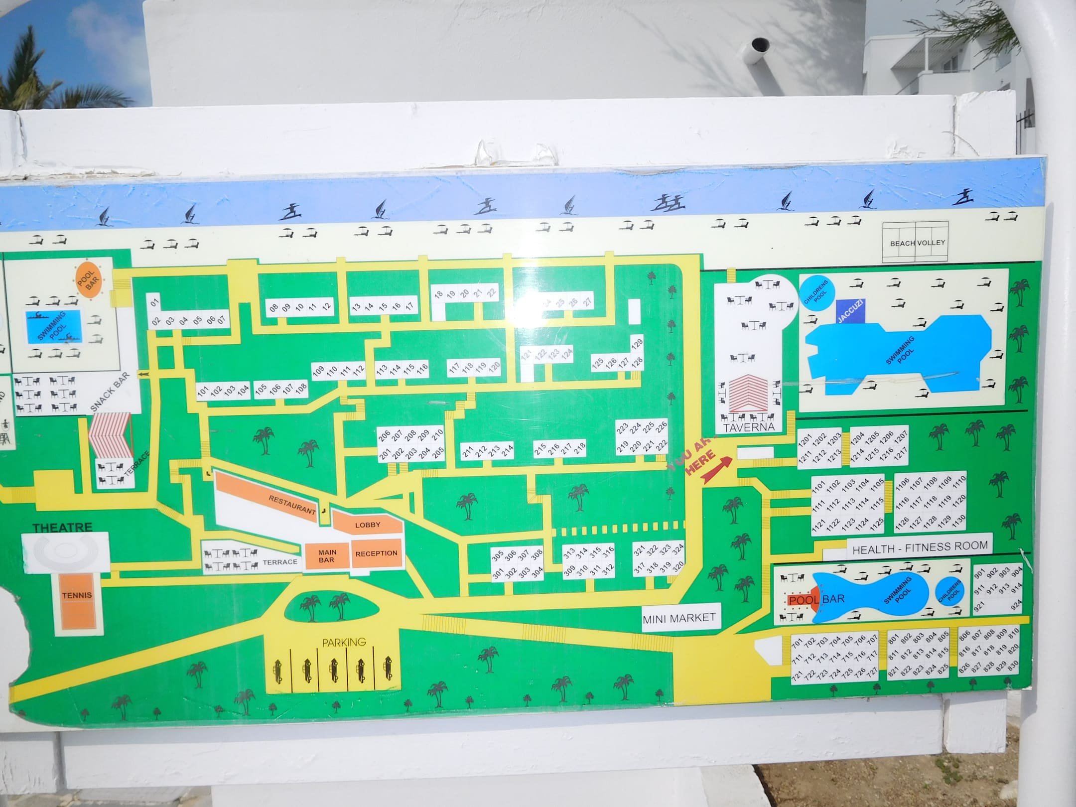 AußenansichtAuf dieser Imfo Tafel ist nichts von dem Zustand vor unseren Bungalow zu sehen.Alles nur grüner Rasen was nicht den Tatsachen entspricht.