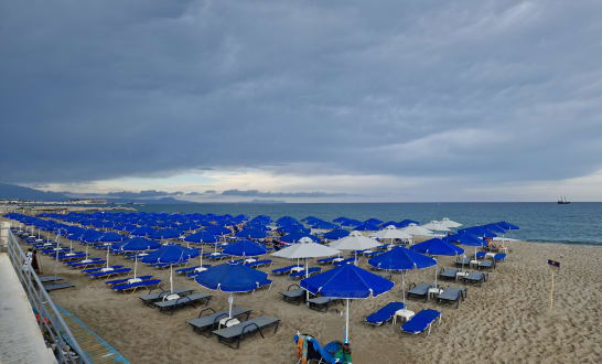Strand von Hotel “Pearl Beach“. Zwei Sonnenliegen mit Sonnenschirm für nur 7 Euro!