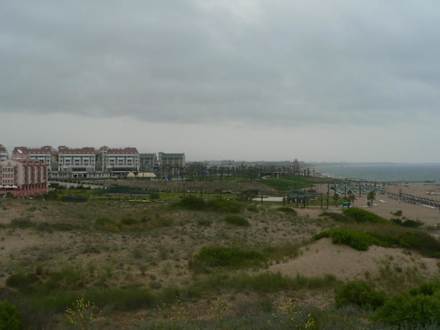 Blick von den Dünen ( ca. 500m rechts vom Hotel) Richtung Side. Hotel ganz links ist das Aspensos, dann das Turan Prince (mit dem rotem Dach) und das Amara Beach (mit dem grünen Dach).
