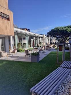 Dieser gepflegte Außenbereich der Lounge lädt zum Cocktailtrinken ein.