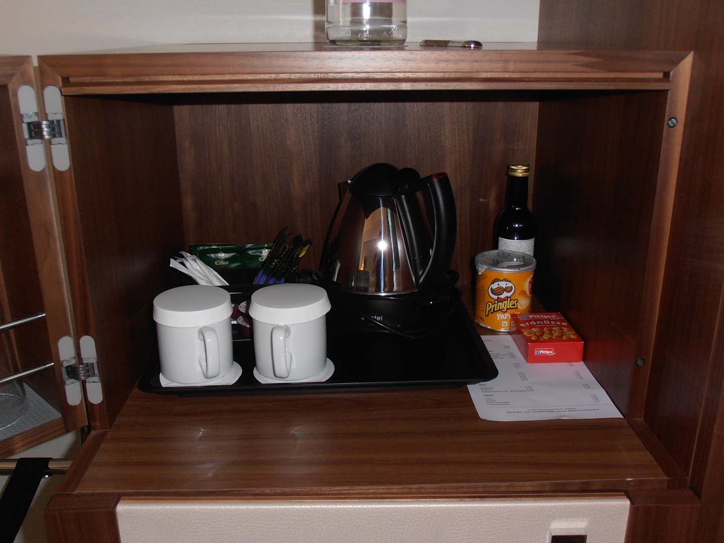 WasserkocherGeöffnetes Schrankfach über dem Kühlschrank in dem der Wasserkocher inkl. Zubehör ist.