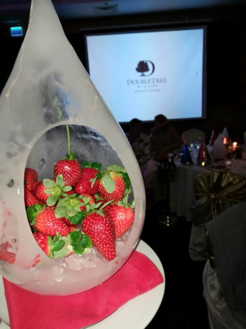 Nachspeise:Erdbeeren im Eistropfen mit Sahne und Puderzucker.