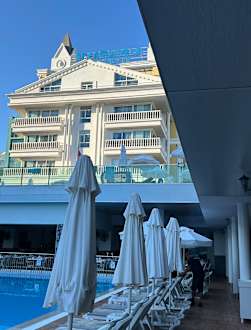 Blick vom Pool zum Hotel