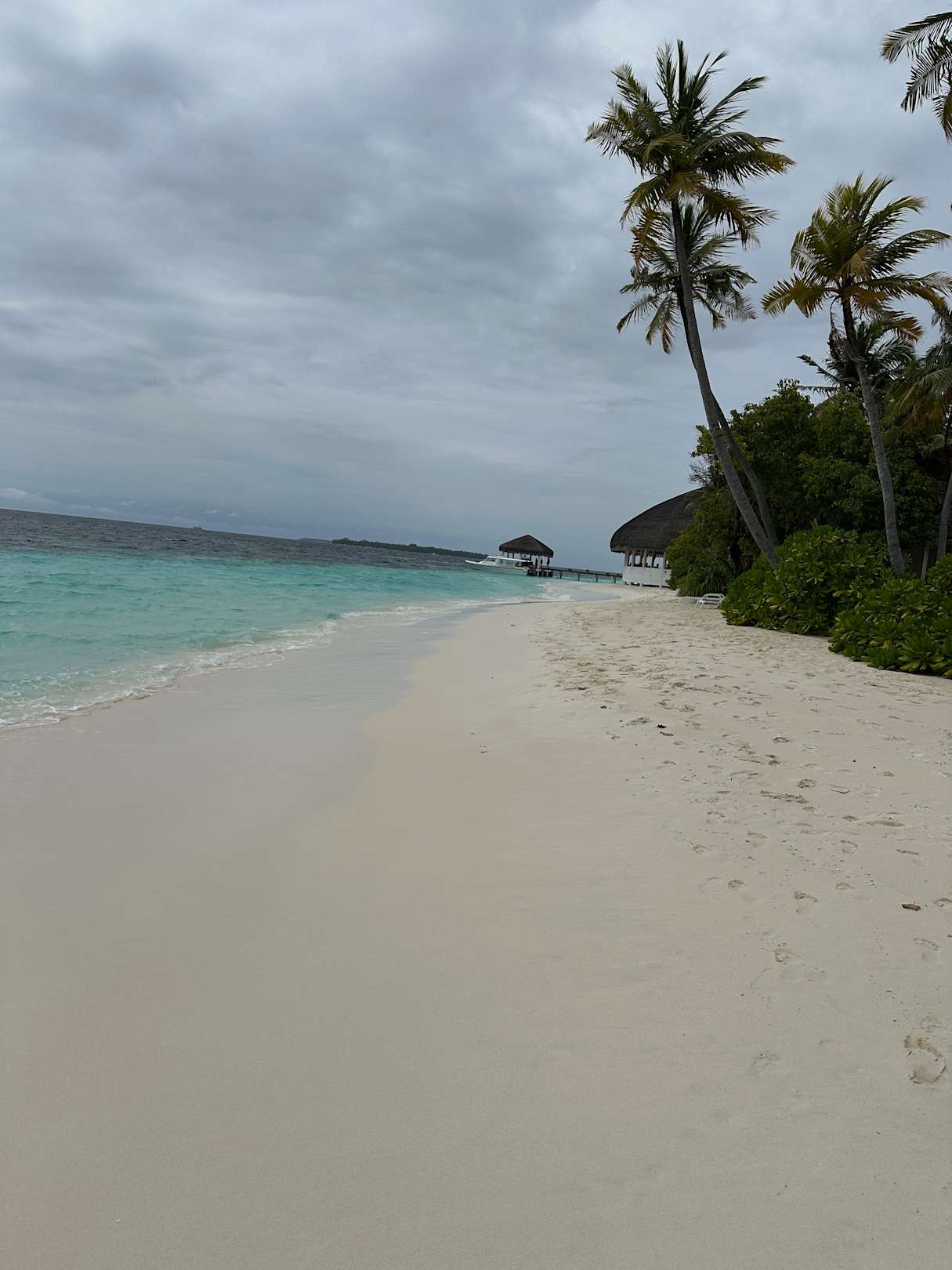 Strand mit Blick auf das Beach-Restaurant und den Bootsanleger für das Schnellboot