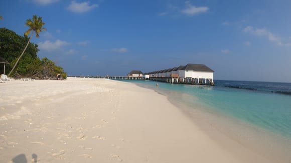 Blick aus Richtung Ankommenssteg Richtung Wasserbungalows
