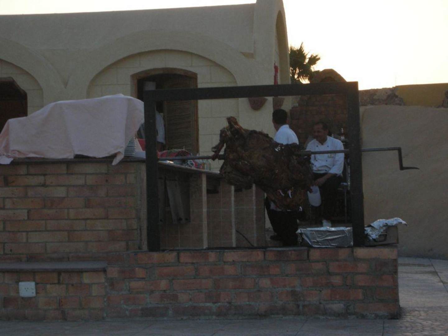 Hier wird gerade im Beduinenzelt ein Lamm gegrillt. Zusätzlich gibt es noch mehr leckere Speisen und danach ist Bauchtanz angesagt, oder Kamelreiten.