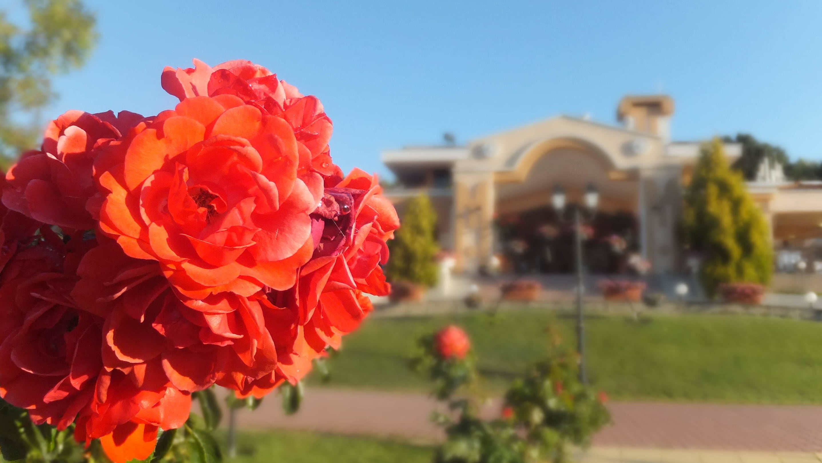 Blüte mit Restaurant im Hintergrund