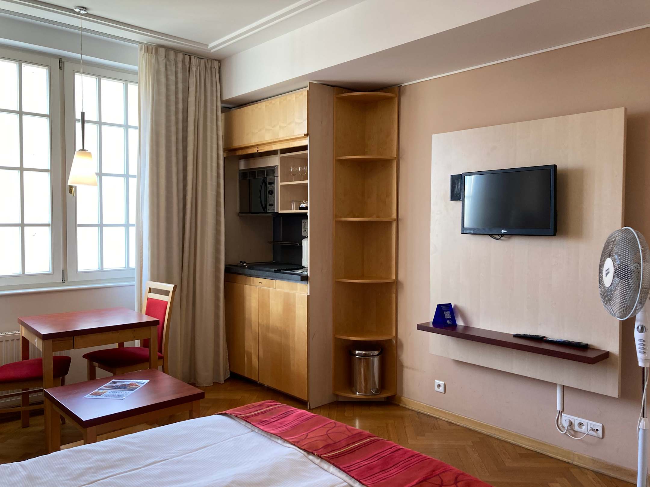 Küche mit Kühlschrank und Mikrowelle sowie Wasserkocher für Tee oder Kaffee.