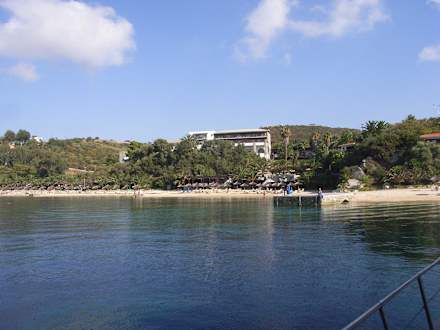 Hotel und Strand vom Boot aus