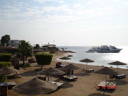 Strand & Co am frühen MorgenBlick vom Wachturm d.Lifeguard (wo ich aber selten jemand gesehen habe), links Richtung Holiday Inn (weiße Gebäude); Tauchbasis und Aquacenter Paradise morgens um 7h