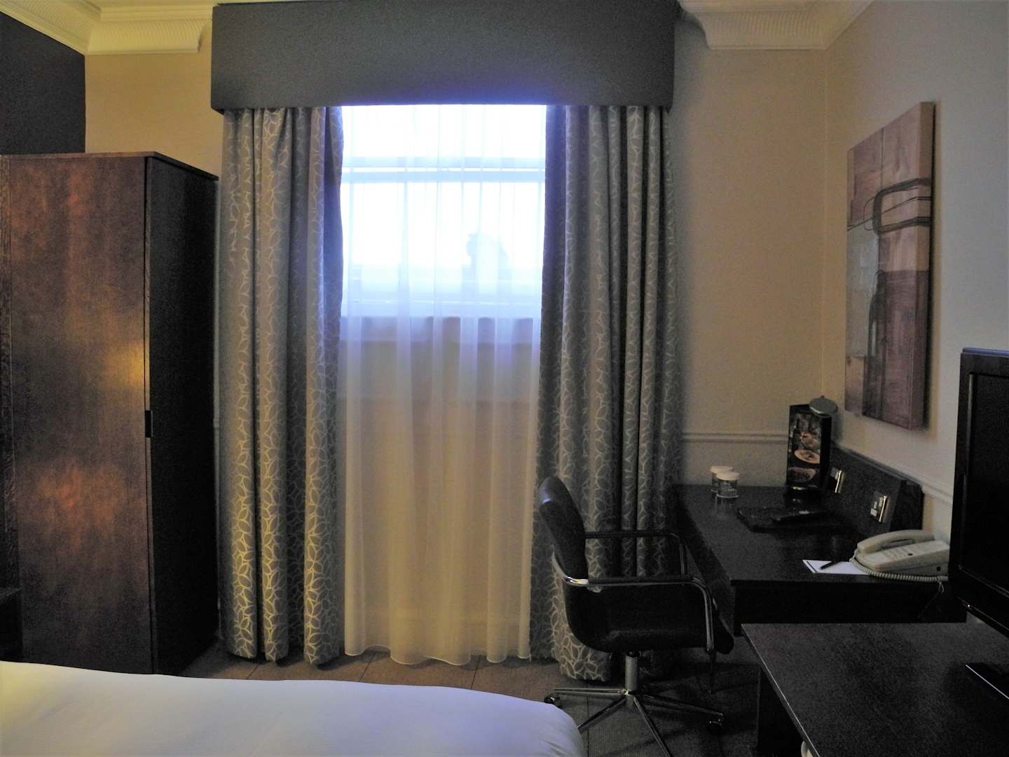 Hotelzimmer mit "Fenster" und einfachem Kleiderschrank.