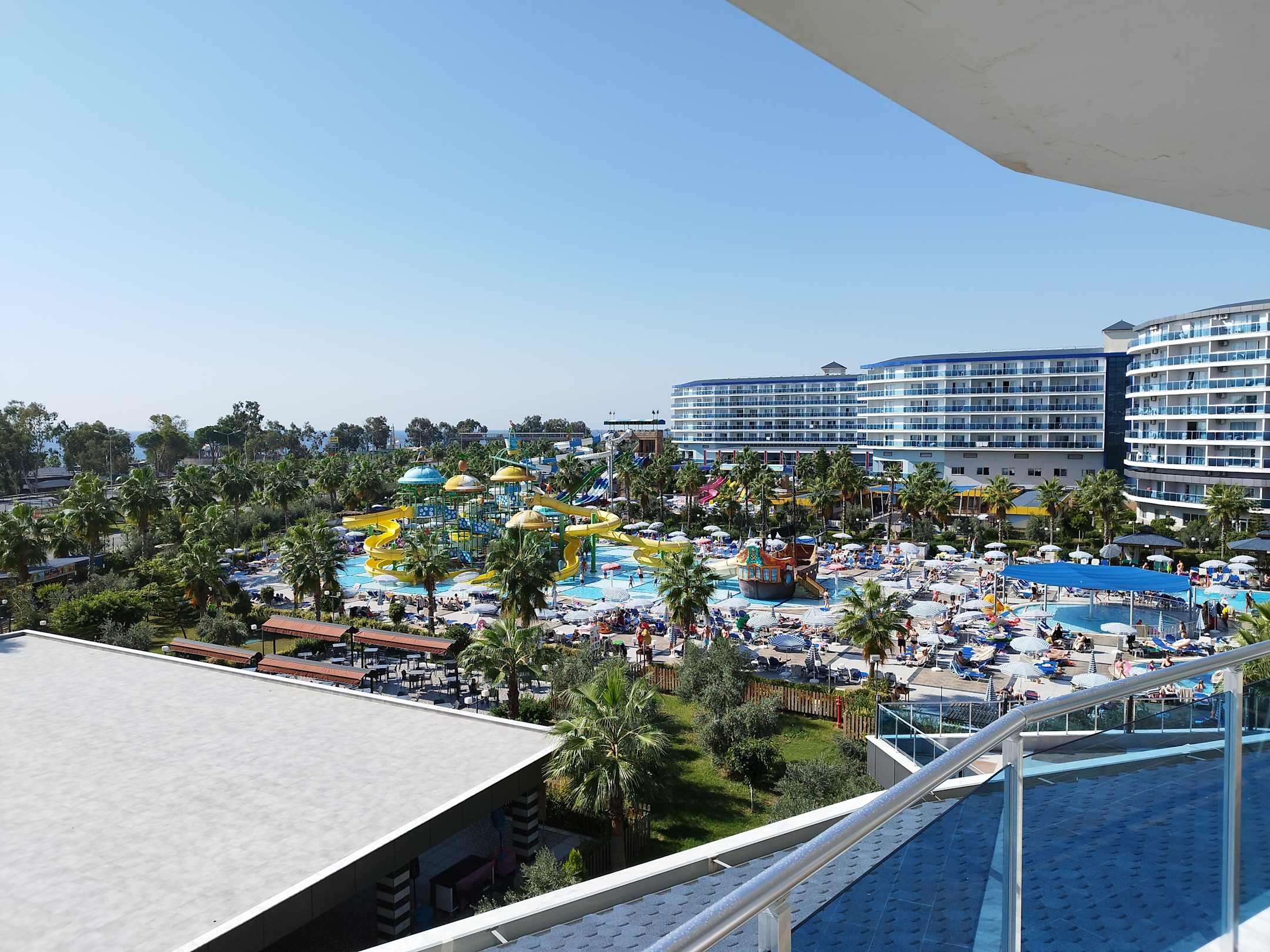 Blick vom Balkon auf den Hotel Pool