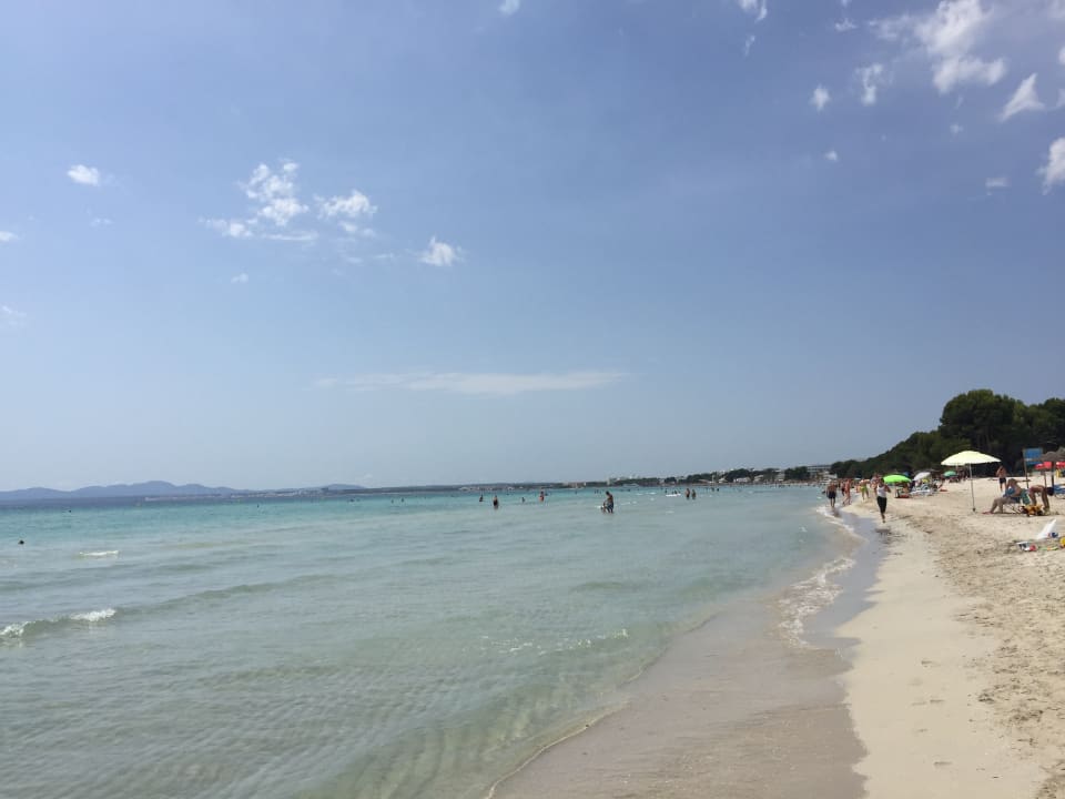 Langer Sandstrand und flach ins Meer verlaufend.