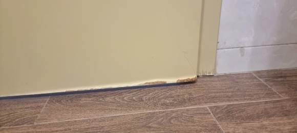 ZimmerDas Furnier der Badtür quillt auf, da das Wasser aus dem Bad dort gegenläuft. Schuld dafür ist die undichte Dusche