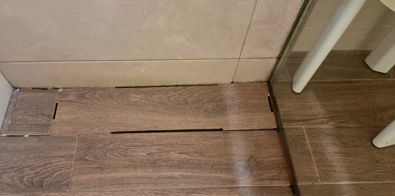 Darunter befindet sich der Bodenablauf der Dusche. Offene Fugen zu breit und nicht passgenau eingearbeitet, hier ist ein Höhenunterschied (Verletzungsgefahr).