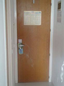durch Vorbenutzer völlig verdreckte Zimmereingangstür, wurde nicht gereinigt oder nur ein wenig abgewischt... das muss eine Reinigungskraft doch alleine sehen...!!!