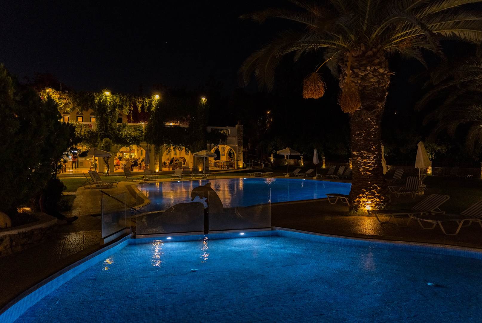 Ausblick über den Poolbereich zum Restaurant