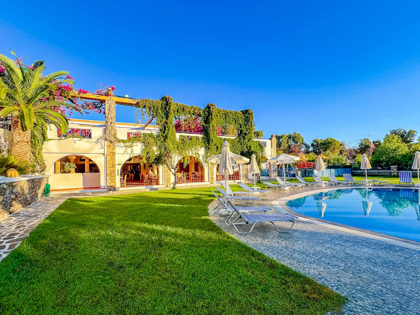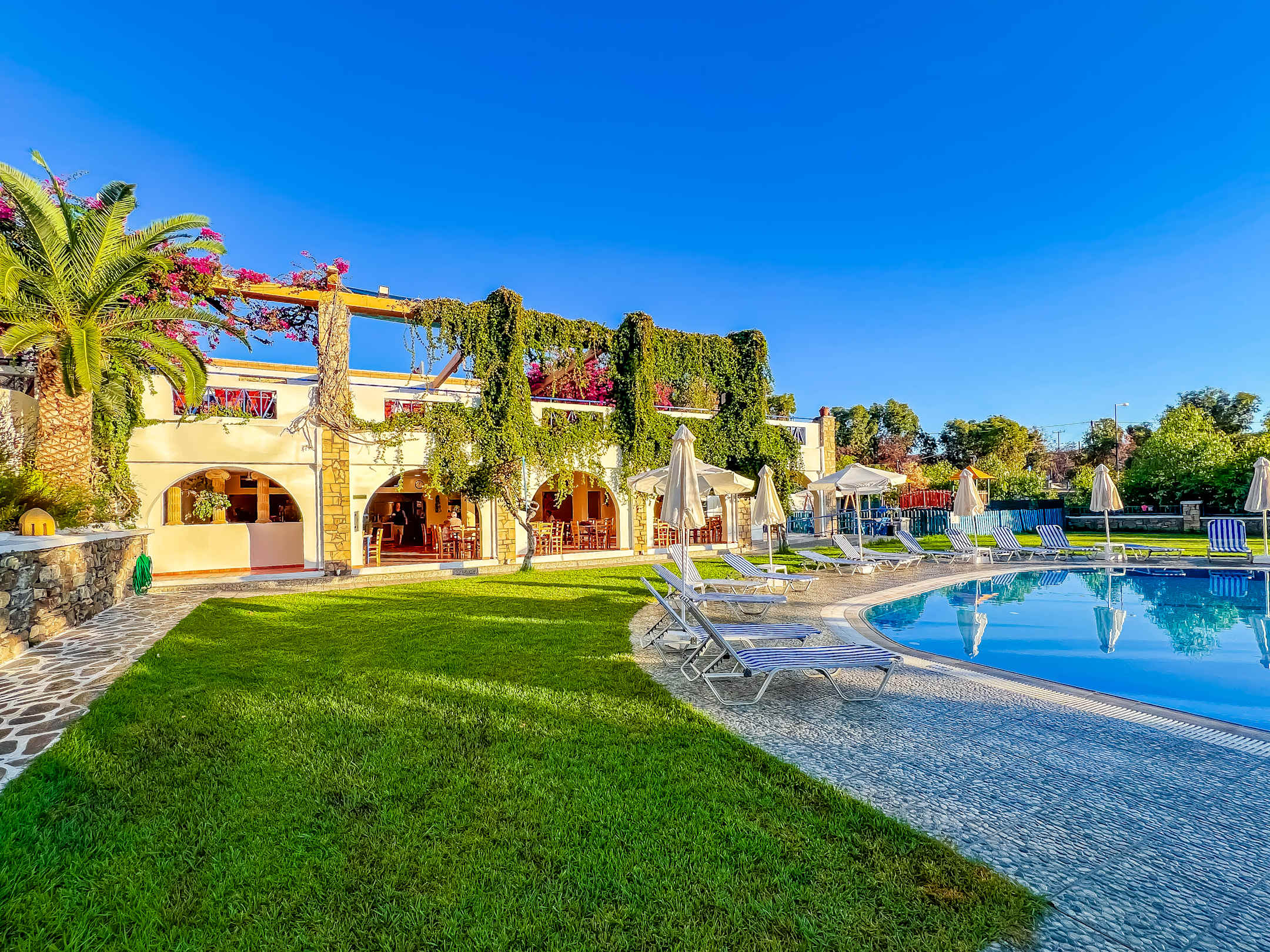 Poolbereich mit Aussicht auf das Restaurant