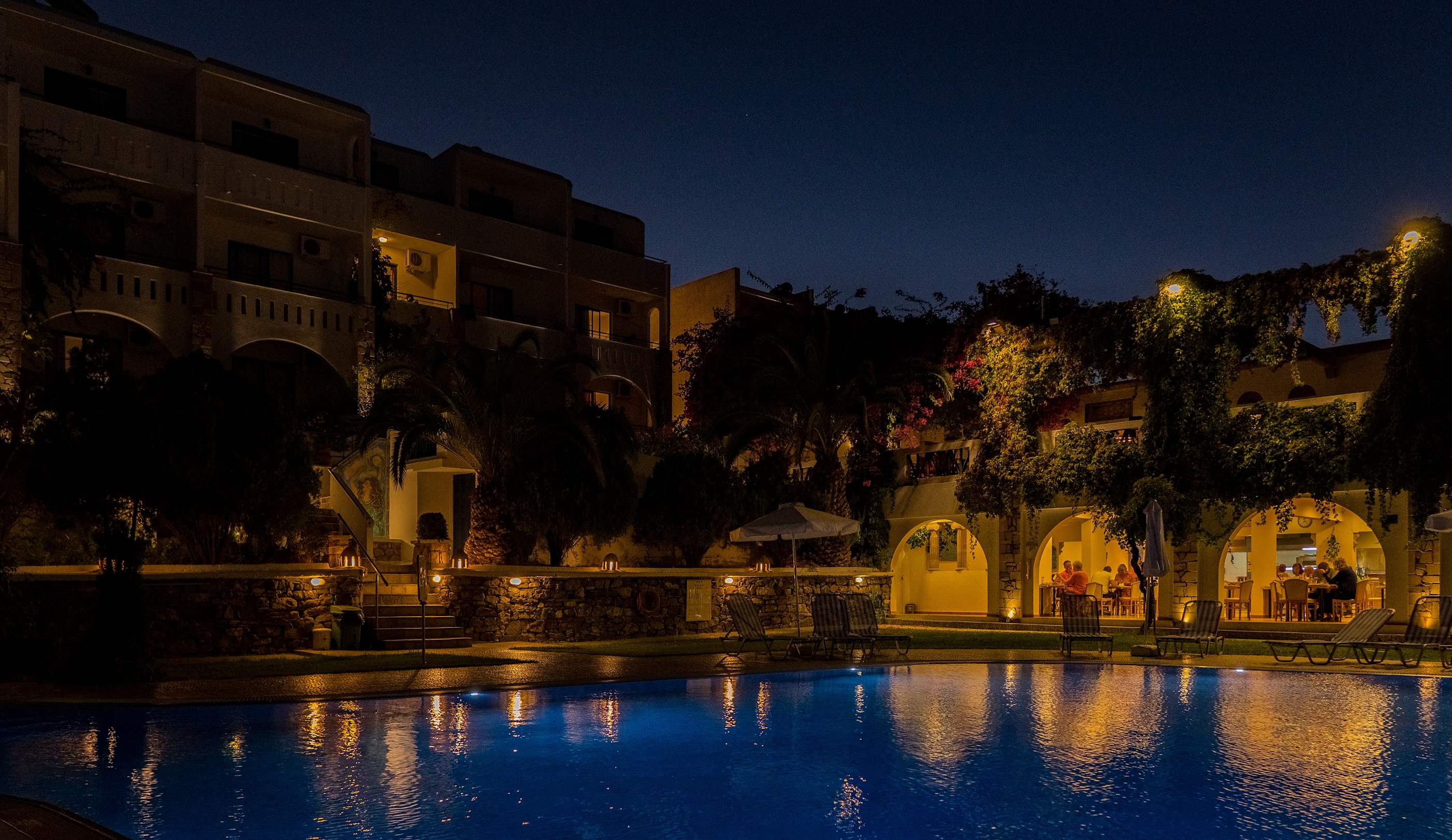 Restaurant Ansicht am Abend über den Poolbereich vom Hotel....