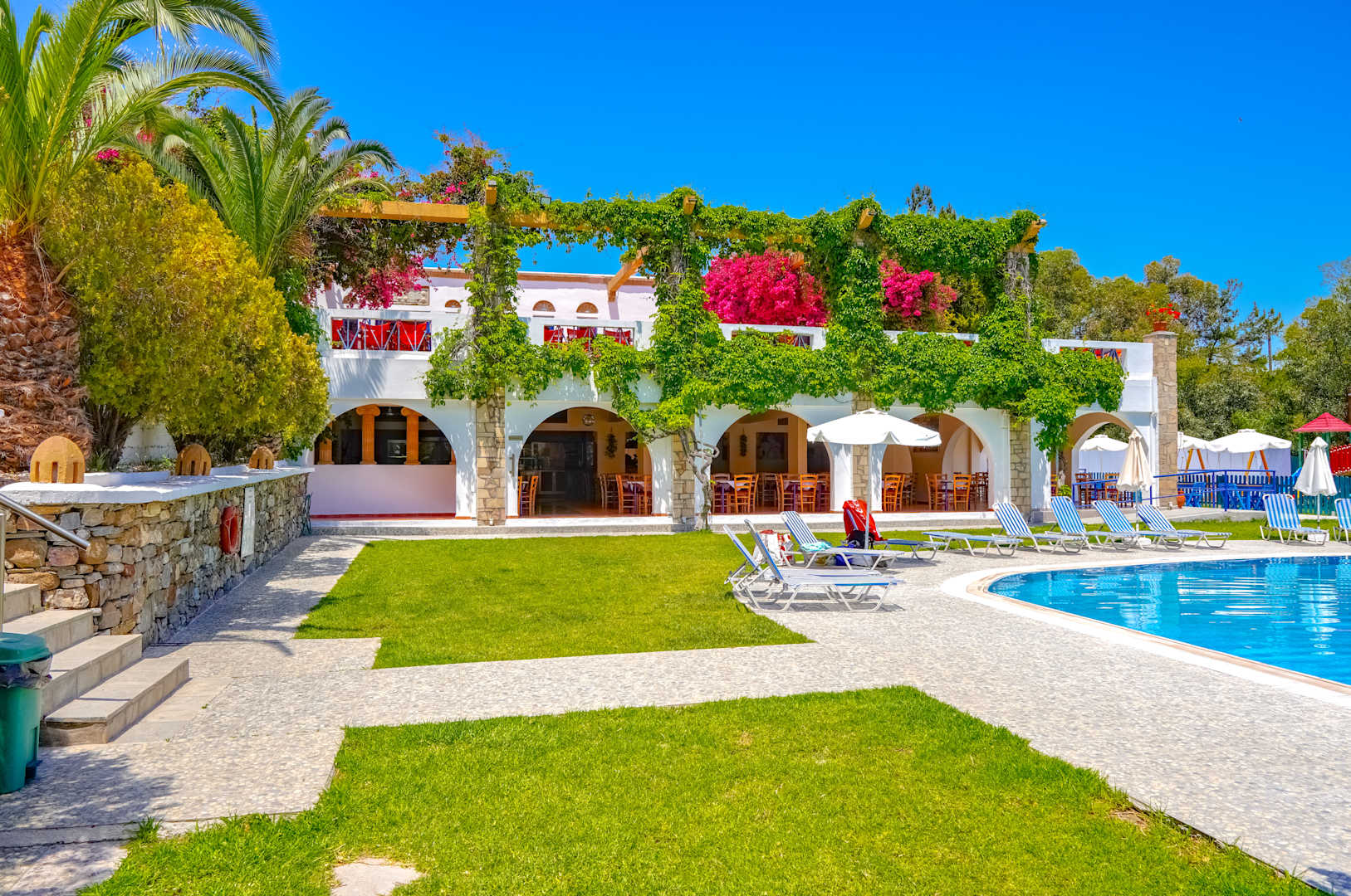 Poolbereich mit blick auf dem Restaurant und der Terrasse die über dem Restaurant ist