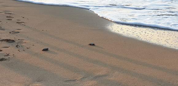 Frisch geschlüpfte, kleine Meeresschildkröten am Strand beim Hotel.