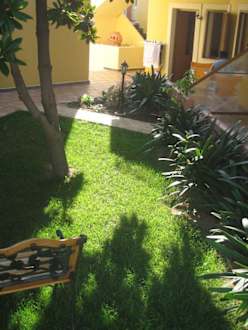 Es grünt so grüngepflegtes Grün im hinteren Bereich der Anlage; Zimmer 113 ist auf dem Bild zu sehen (vorletztes Studio im EG auf der linken Seite)