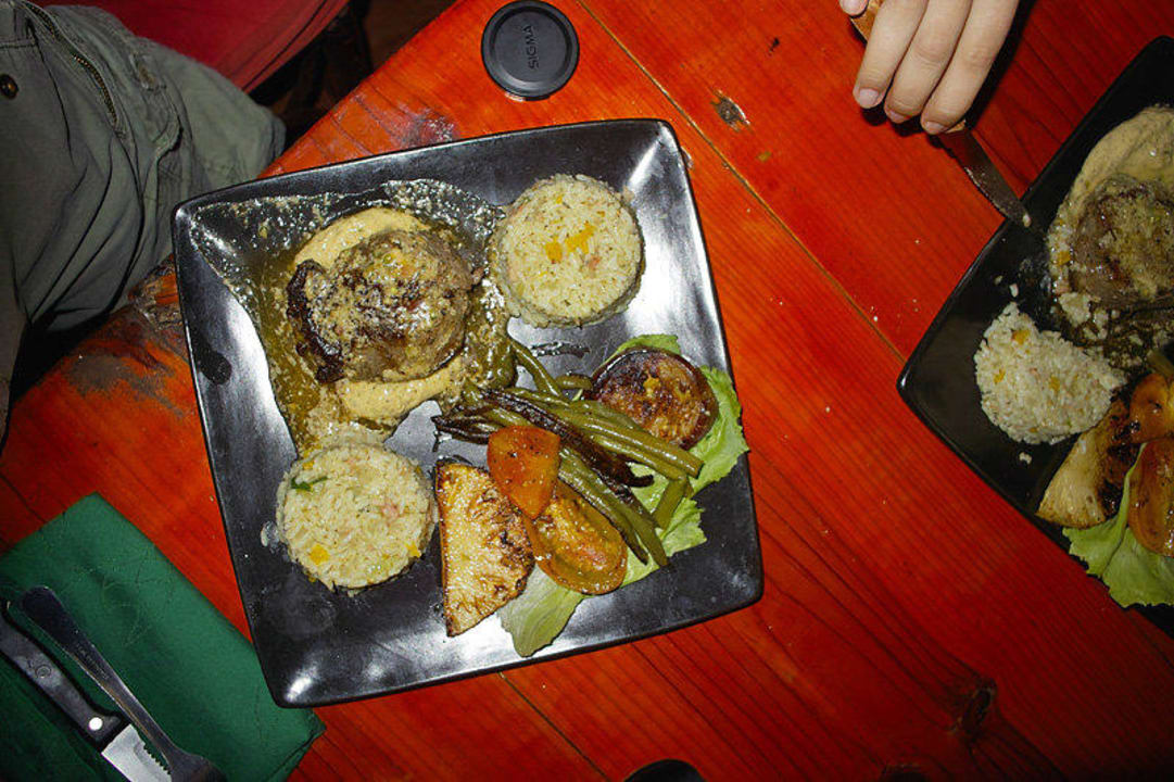 Zartes Rinderfilet mit Ananas, Bohnen, Reis, Tomaten, Salat und mehr