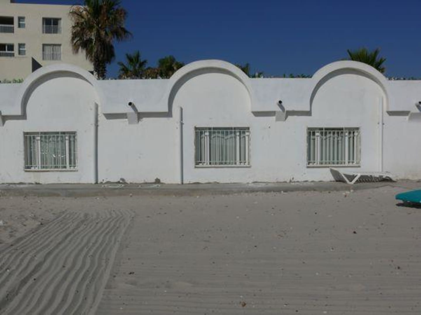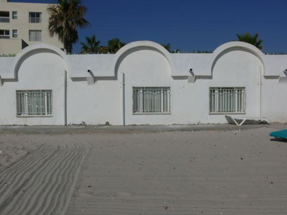 Blick von Strand auf die Familienzimmer SuperiorDie vergitterten Fenster sind nur wenige Zentimeter vom Sand entfernt.