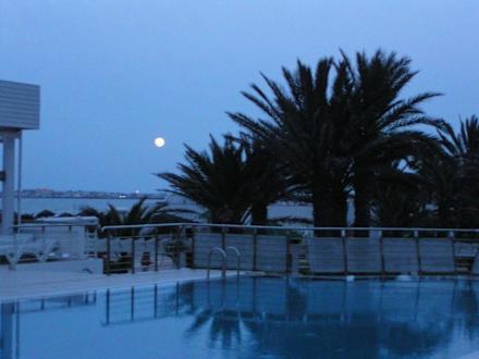 Pool mit Palmen am Abend