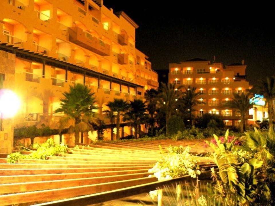 Hotelgebäude bei Nacht von der Terrasse aus