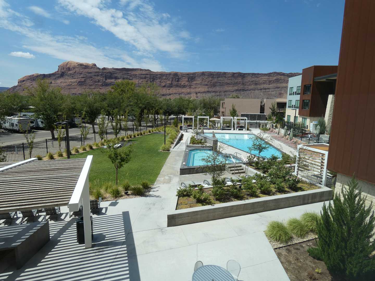 PoolBlick auf den Poolbereich von einem der Zimmer, Schalter für die Whirlpools ist links am Pfosten beim BBQ.