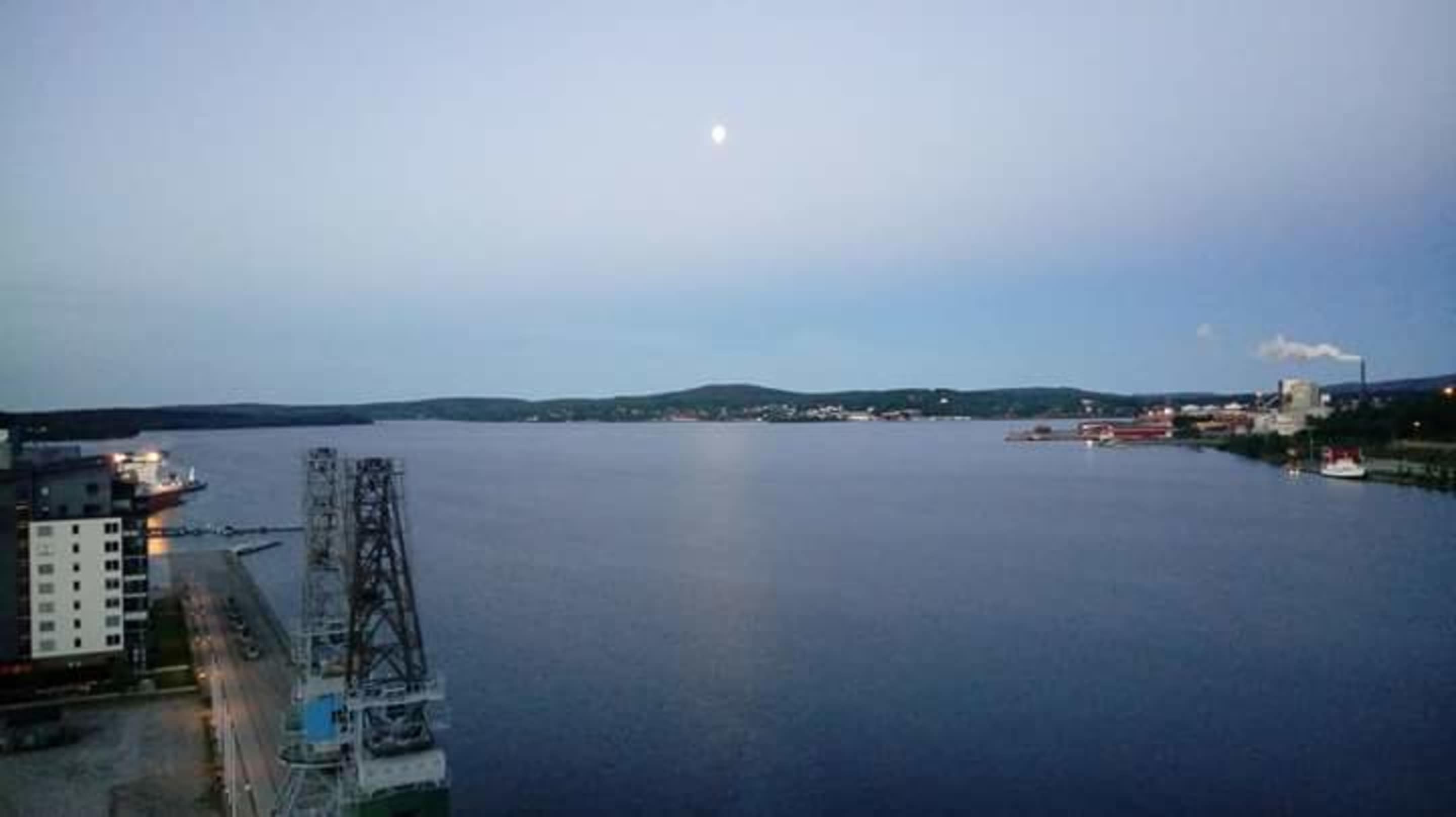 Blick aus unserem Hotelzimmer im 12. Stock auf Bucht und Hafen von Örnsköldsvik.
