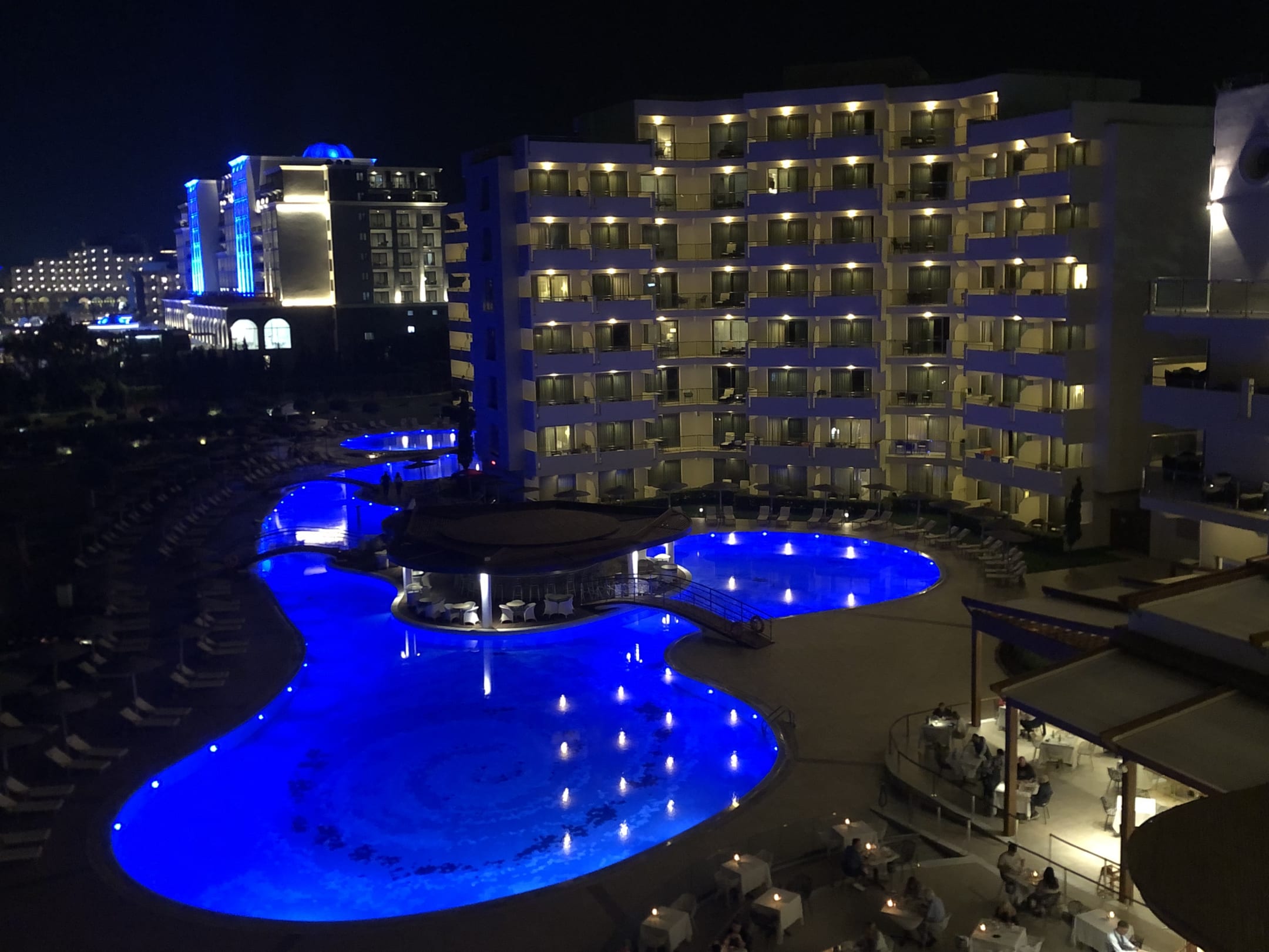 Abendstimmung mit Pool und Nebengebäude