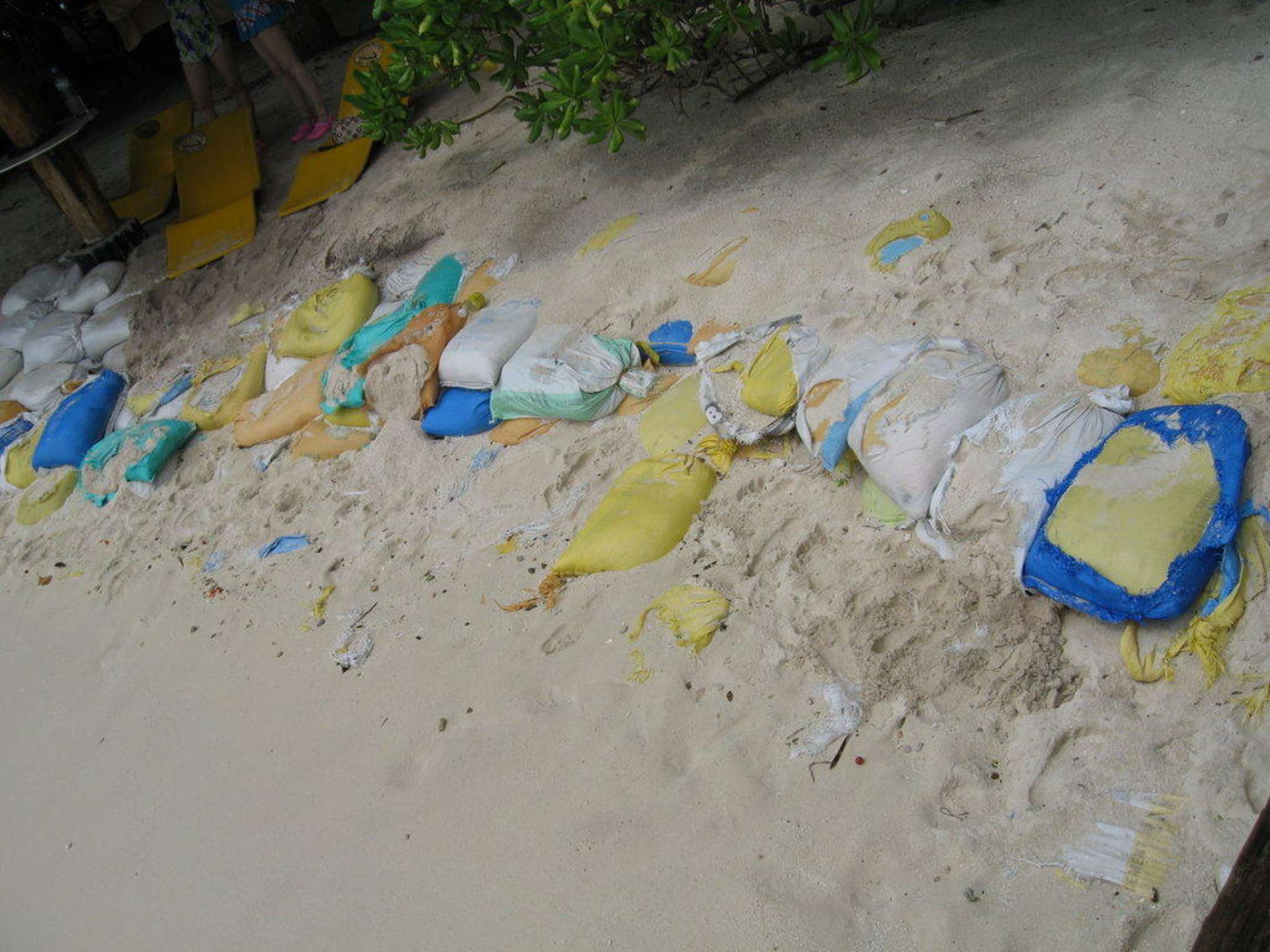 Überall auf der Insel sind die Erosionsverbauungen mittels farbiger und ausgefransten Kunststoffsäcken gebastelt. Hat eher die Optik einer Müllhalde.