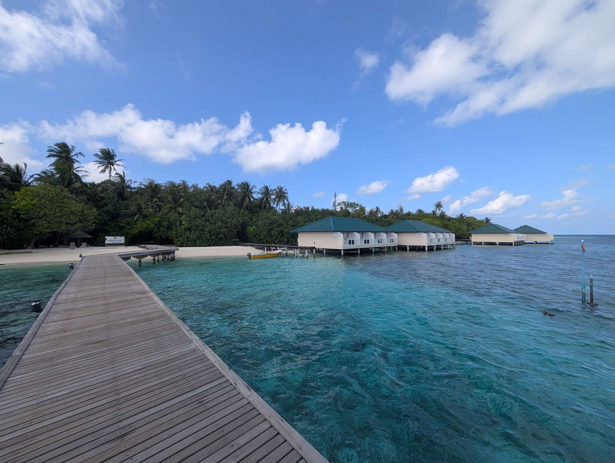 Ankunftssteg mit Blick auf Insel und Wasserbungalows