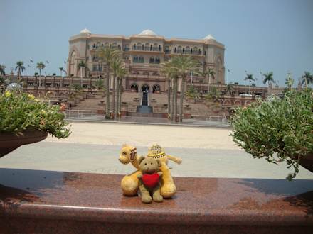 Außenansicht Emirates Palace. Das Kamel kann man sich in der Emirates Palace Boutique kaufen.