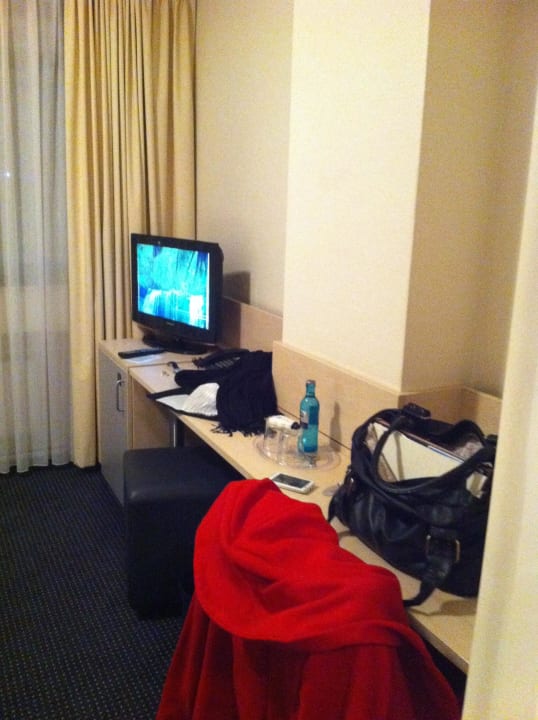 Fernseher und Schreibtisch, keinerlei Unterlagen zum Hotel, keine Servicebeschreibung. Nichts. Unter dem Fernseher der leere Kühlschrank von der wohl ehemaligen Minibar
