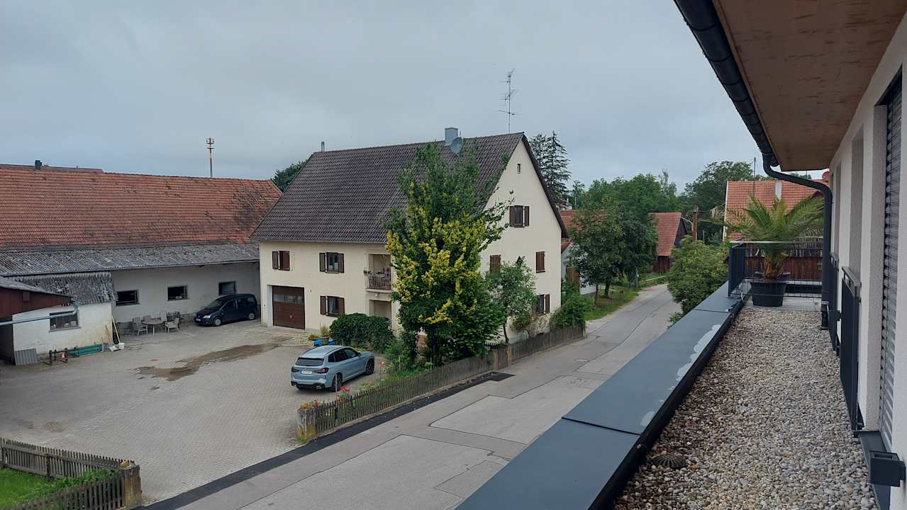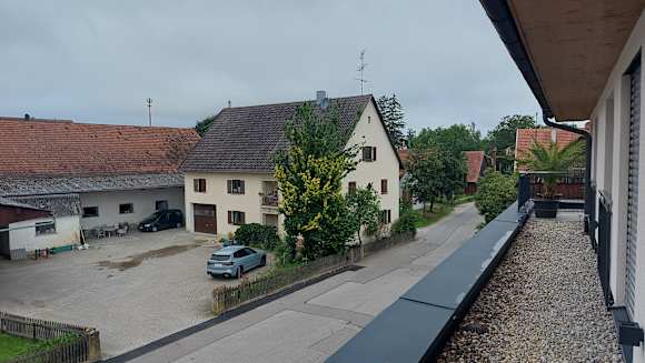 Gegenüber befindet sich eine Art Bauernhof.