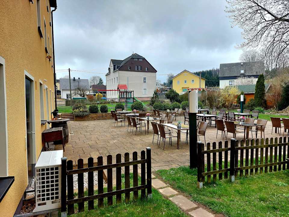 hier der Biergarten hinter dem Haus (im April nur für 15 Minuten mit Kaffee genutzt)