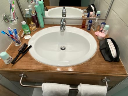 Das Waschbecken uralt und sehr schlau gebaut. Zum Zähne putzen und waschen durfte man sich immer weit strecken, damit man an den Wasserhahn kommt und dann noch den Handtuchhalter davor geschraubt. Super Bauweise!!!