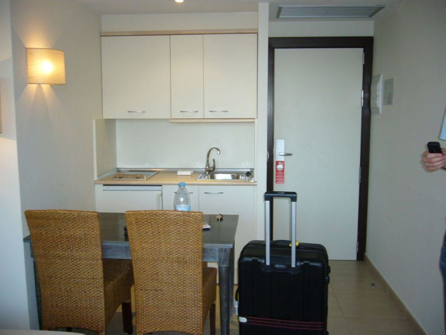 Kühlschrank funktioniert kostenlos, den Inhalt der ausgeräumten Küchenschränke kann man für 4,50 Euro pro Tag buchen, Mikrowelle für weitere 5 Euro pro Tag.