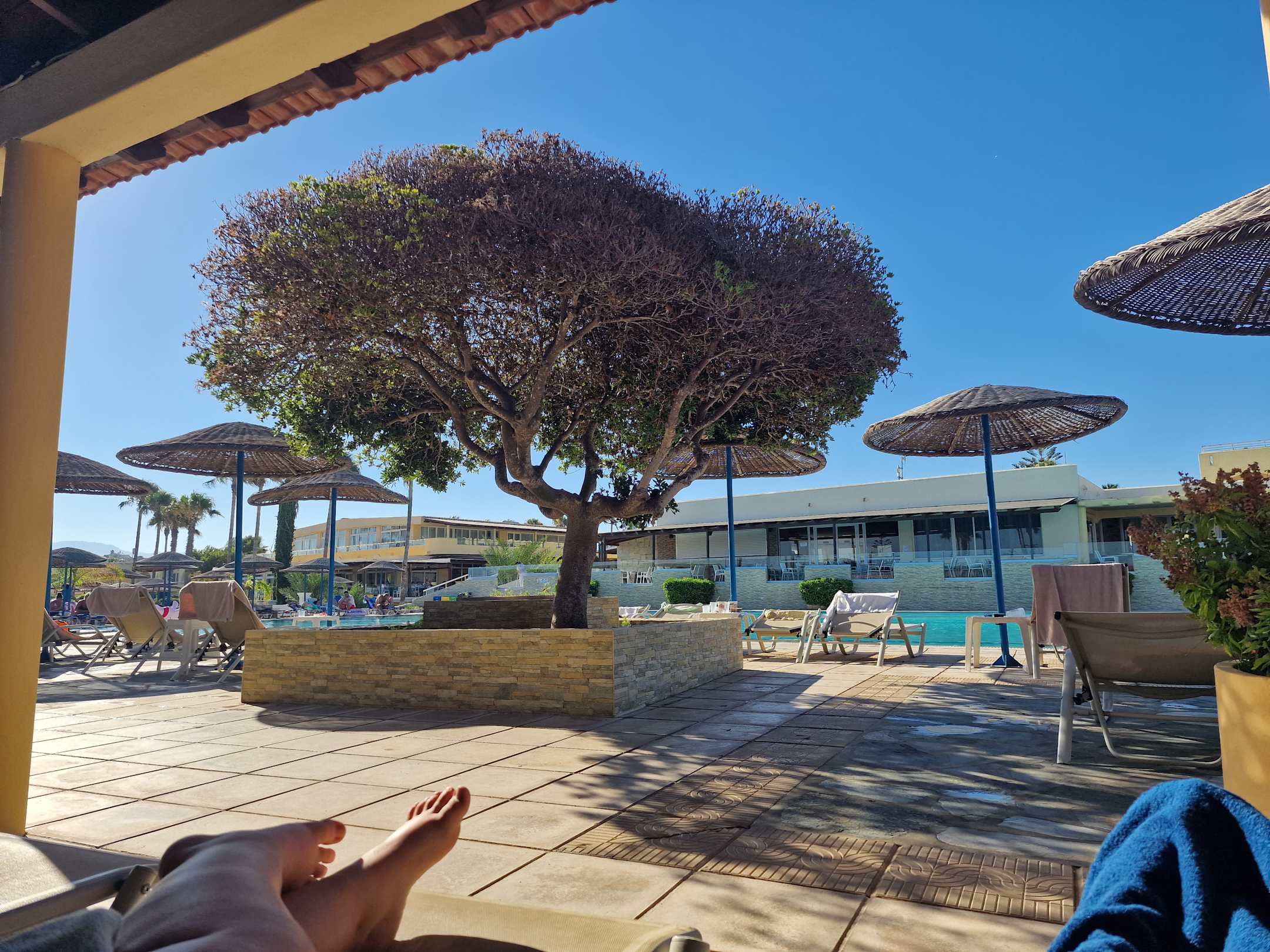 Blick von einen schattigen Platz auf den Hotelpool am Morgen.