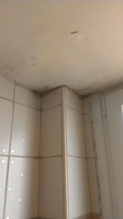 Decke nach Wasserschaden schimmelt, Putz fällt ab.